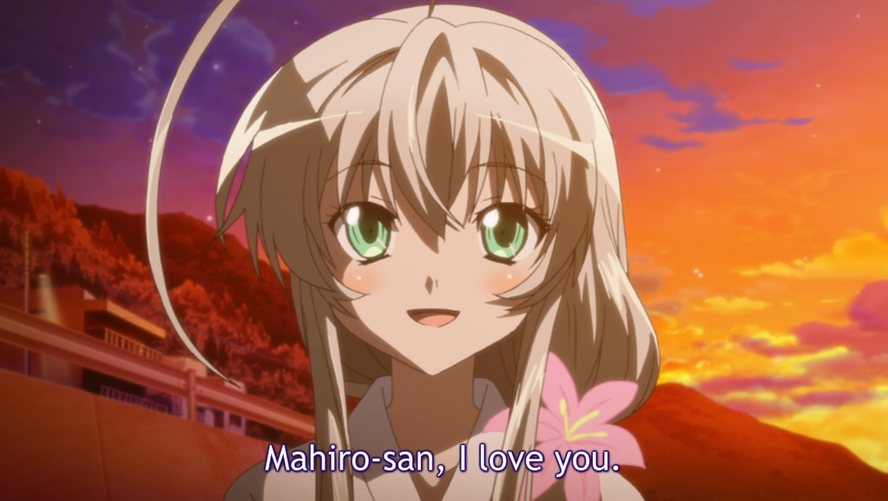 And this brings me into my final point of discussion: Nyarko’s love for Mahiro. Now, this isn’t the first show I’ve seen where the girl is throwing herself all over the guy. It is, however, among the very few shows I’ve seen where the girl backs up her words with action. Nyarko says she loves Mahiro, over and over again. Episode 7 (which I won’t spoil) ends with a really beautiful scene between the two of them, in which Nyarko tells Mahiro why she’s always joking around. It’s an amazing line, one that explains her behavior and cements the reality of her love for him. Nyarko’s not perfect, but there’s no doubt that she really does love Mahiro. It’s rather stunning that something as pure and beautiful can exist in a show where the status quo is inappropriateness and nonsense, but it’s there nonetheless. And I really do love that about this show.
