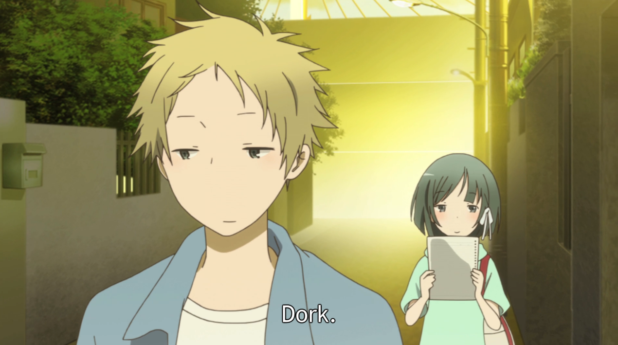 The ending itself? Well, I wasn’t much of a fan of having Fujimiya collapsing and then forgetting Hase again. It felt pretty forced to me. I’d much rather have had her start to deal with the fallout, but instead she’s regressed to where she was at the beginning of the series. Right now, that doesn’t make me happy, but One Week Friends has enough watching credit with me that I’m willing to give them the benefit of the doubt. The show’s on really slippery ground, though, and resorting to tropes like the tripping scene and the transfer student (seriously? transfer students are LAZY writing) kind of dulled the impact of the ending for me. If we had gotten more of episode 8-like Hase and Fujimiya interactions, the ending could have been devastating.