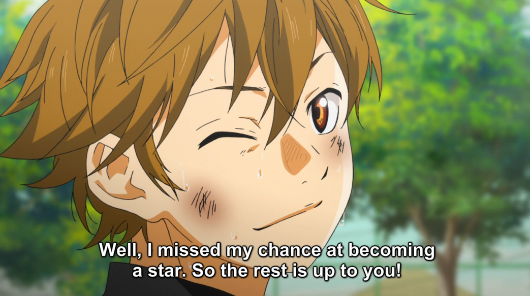 Last week I was talking a little bit about Watari and how I thought he, despite his airs of narcissim, seems to be a pretty decent kid. The soccer game, particularly his behavior after just missing the tying goal, confirmed this for me. Watari seems to think he’s missed his chance to be a star, but can’t see that he’s already there. We’re returning to a theme we’ve already touched on in this show: what it means to be a star. Watari seems convinced that he can’t be a star if he’s losing, but Kaori’s performances in the first couple episodes is a glimmering rebuttal to this way of thinking. For Kaori, to be a star is to simple to shine bright enough to touch other people. It seems Kousei isn’t the only one who needs Kaori’s light in his life…