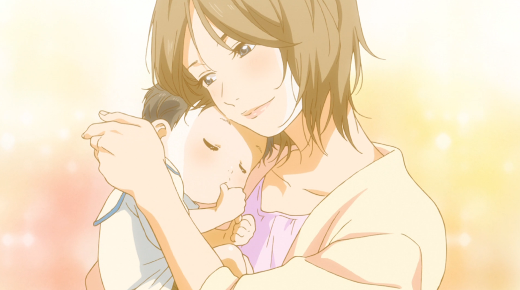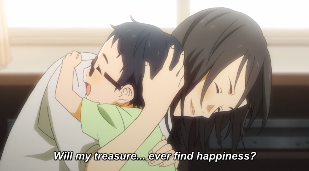 The most beautiful thing in this episode, for me, was at last hearing what it was Saki wanted for Kousei. As she’s lying in her hospital bed, she articulates her worries over him—simple things, things a mother would worry about. Would he brush his teeth? What if he gets sick or gets hurt? How will he be without his mother there for him? It is, really, a tragedy, that a woman who so desperately wanted to love her son could find no better ways to show him that love and that she was left so burdened by the regret of her own passing and of her own choices. For Saki, it was an impossible situation. Like I said earlier, I don’t believe this absolves her of the awfulness she inflicted upon Kousei. But it does allow her to be what she was, and it’s as a broken mother that we and Kousei can leave her behind.