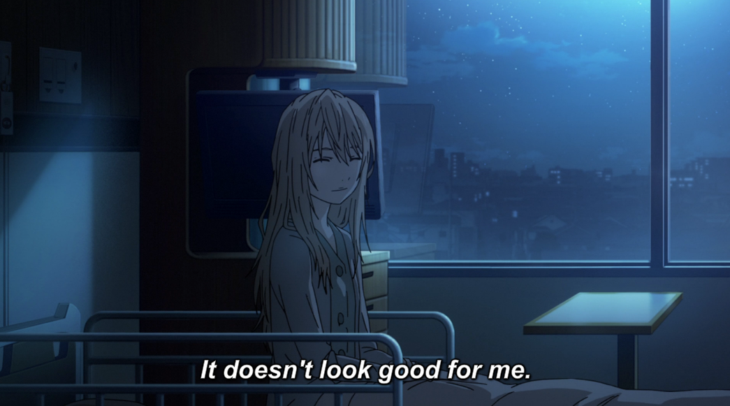 In short, I honestly feel like Kaori’s role in KimiUso drags down the rest of the show, including the arcs of characters I find more interesting, sympathetic, and compelling. It’s like she’s (ironically) a dark cloud hovering over the entire show, a kind of damper that blunts in the emotional impact of the teenage angst the rest of the characters are feeling because…despite it being a matter of degree, as you’ve said, how is Tsubaki’s anguish over Kousei leaving supposed to compete with someone literally about to die? From an audience perspective, it’s basically impossible to equate those. KimiUso is just telling to many stories, and not all of them fit together well.
