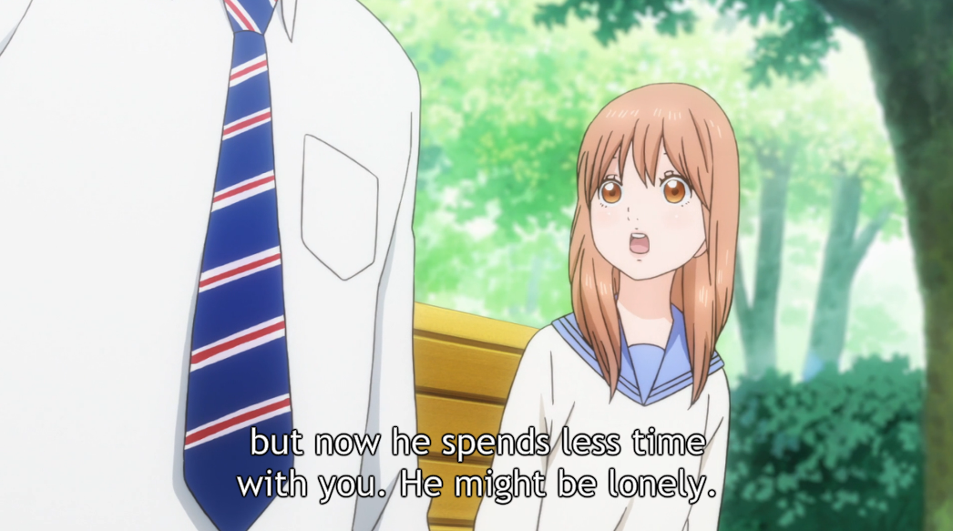 So yeah, it’s not a Big Theme for this particular story arc that the author wanted to hammer into the audience, it’s there to add nuance and texture to Takeo’s growth as a human being. I love it. I doubt it’s going to be addressed further in the next ep either, as it will probably zeroes in onto the friendship aspect. A good friend might respect and go along with what someone wants, but a great friend will know what someone NEEDS and act accordingly.