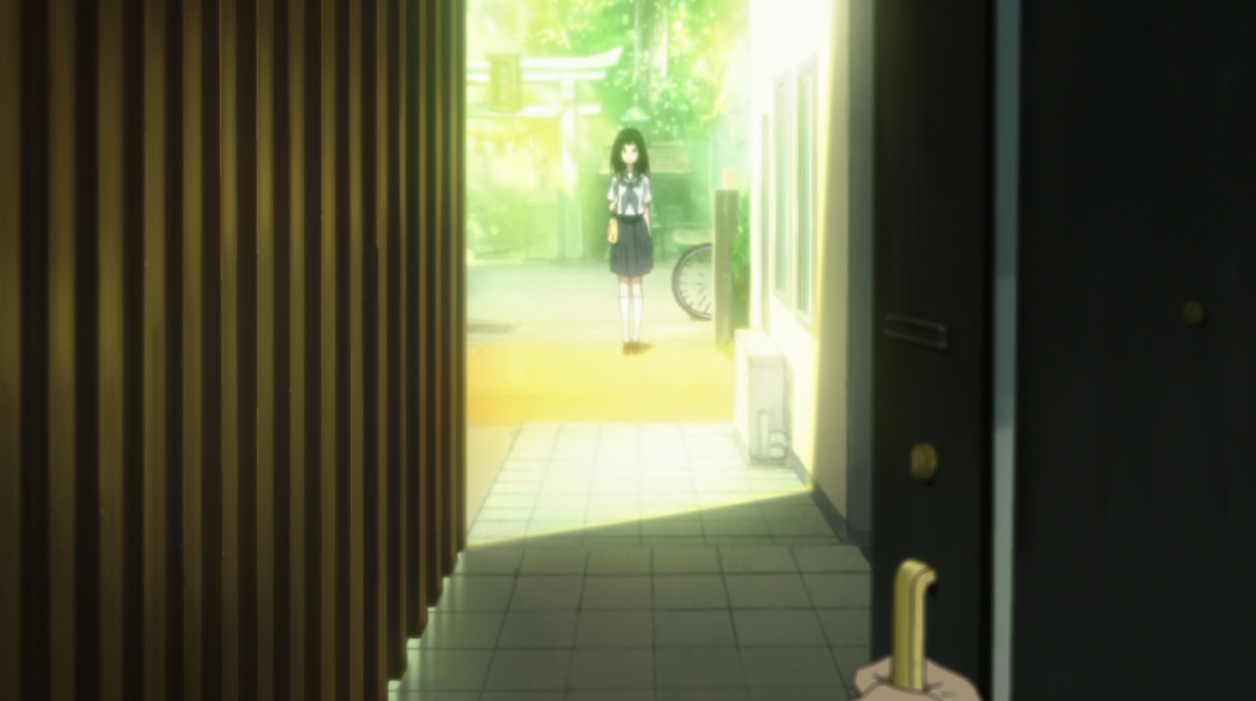 And I guess it all kind of starts and ends with Irisu (who I presume—upon rewatch—is the main typist in the episode’s opening sequence of text and instant messaging). In case it isn’t immediately apparent from the four screenshots above, her main visual theme is light and shadow, together. After seeing only her(?) fingers in the pre-OP scene [1], her initial entrance is almost framed as that of a villain—her face shrouded in shadow until the last moment, when she emerges into the light to greet the classics club. And this young woman of questionable intentions perpetuates this suspicious first impression by the way she dodges Oreki’s questions and generally acts mysterious prior to showing the Classics Club members Class 2-F’s film[2].