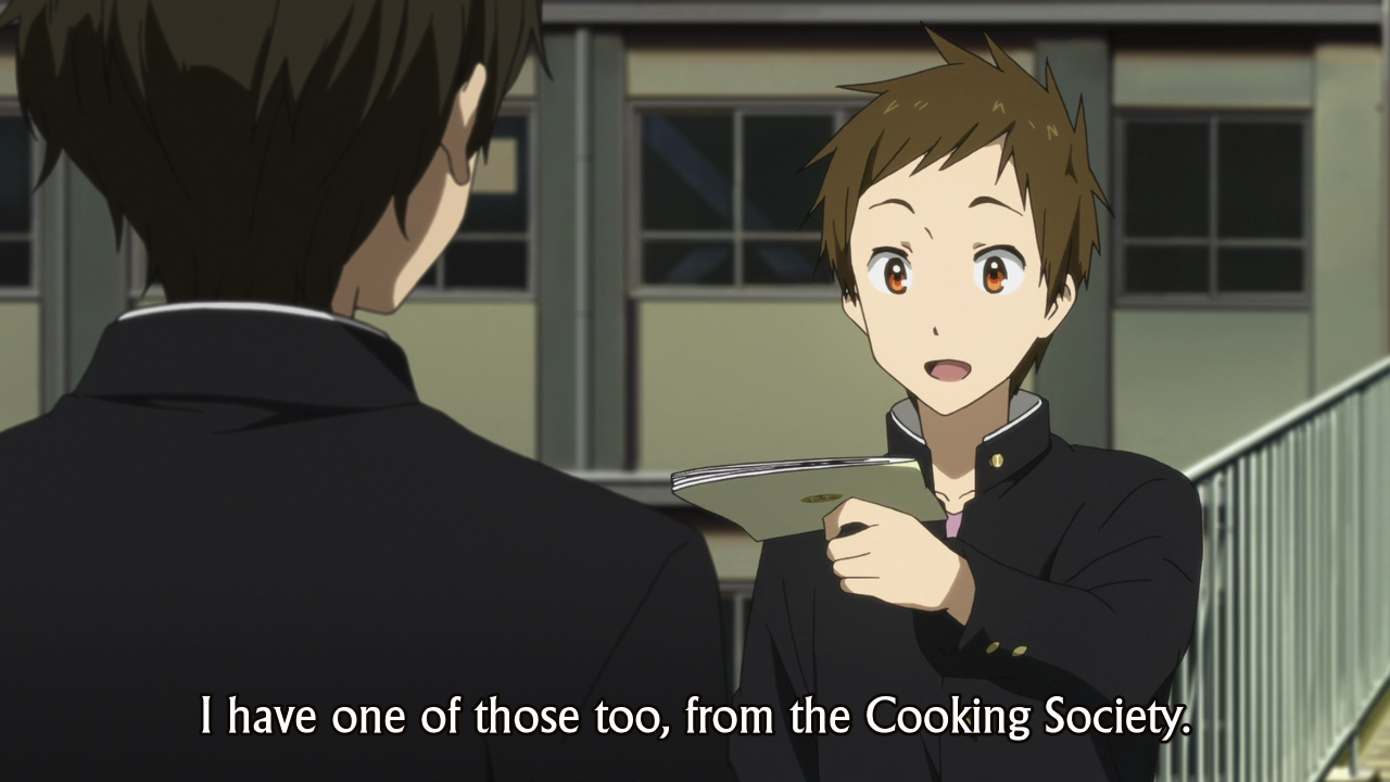 Hyouka 16 Final Scene 14 Published December 13, 2015 at 1280 × 720 in Hyouka, Episode 16 ← Previous Next → This falls out of the cinematography talk for a bit, but Satoshi is eager and willing to hand Oreki the things he’s picked up. After all, Satoshi is a collector—not a detective.