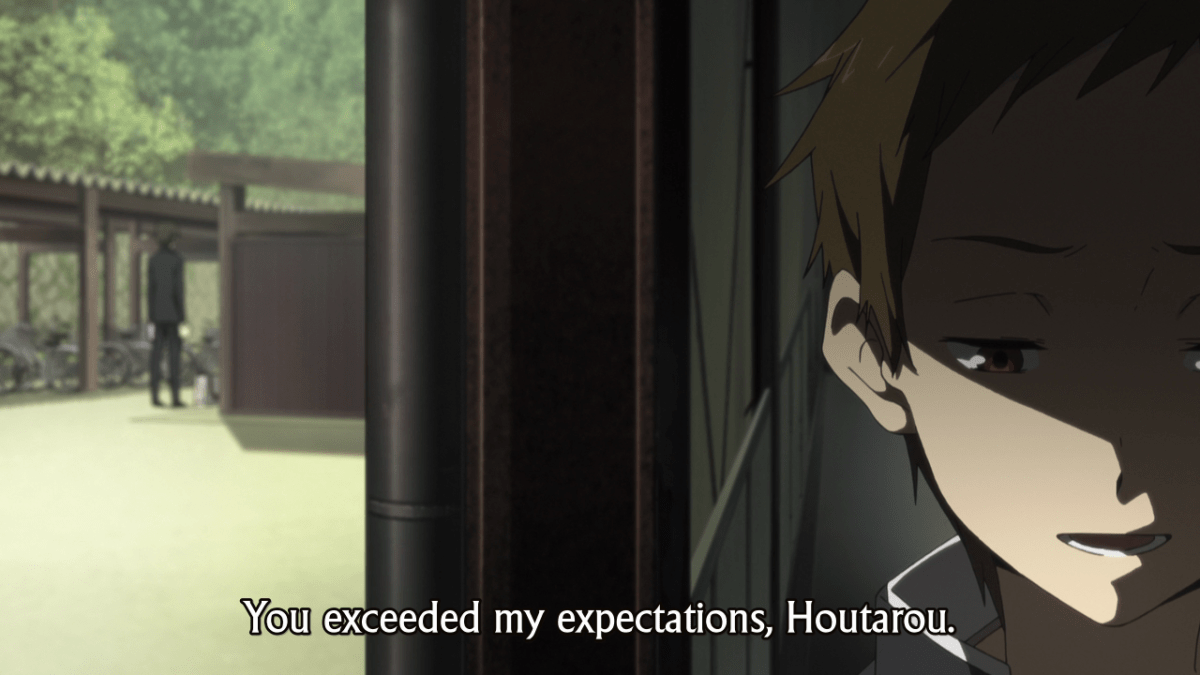 (2/2) …which sets up this shot, which again does the frame split between dark and light, but also doubles up on the visual motif by returning it to Satoshi’s face as well. This shot also inverts the prior one I pointed out that had Satoshi in the background behind Oreki. The space is maintained, but Oreki is not looking after Satoshi.