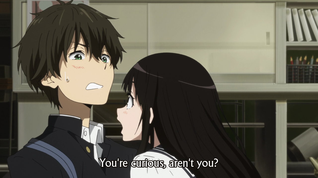 Hyouka 18 Oreki Mystery 3 Published January 1, 2016 at 1280 × 720 in Hyouka, Episode 18 ← Previous Next → (2/6) Oreki reacts, tries to escape.