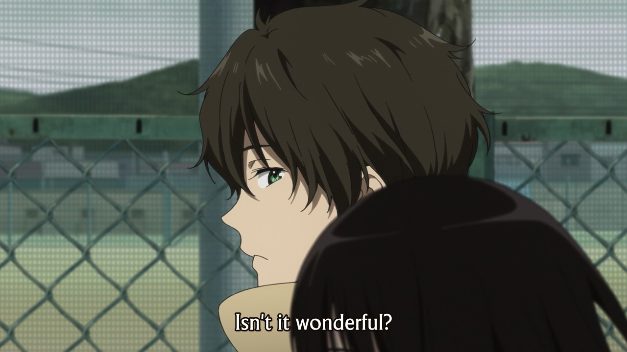 [2/2] We then cut to this shot—one more or less identical to Chitanda’s prior shot. It’s a reversal of the way the two of them were paralleled in the first shots of the sequence, but only in order. However, note that Chitanda starts this line of conversation.